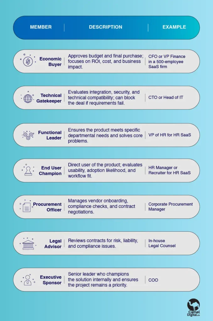 These individuals bring different perspectives, priorities, and influence to the table, so you should prepare your sales offer with each member’s needs in mind because they will evaluate and discuss it together before making a decision.