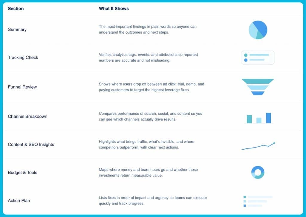 Here’s what you’ll usually see in a SaaS marketing audit report: