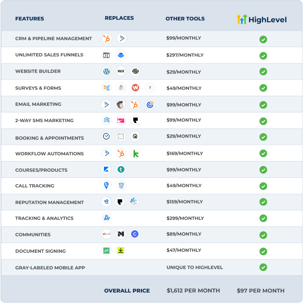 GoHighLevel allows full white-label customization, including logos, colors, and menu items. Beyond CRM, it includes tools for social scheduling, invoicing, and reputation management.